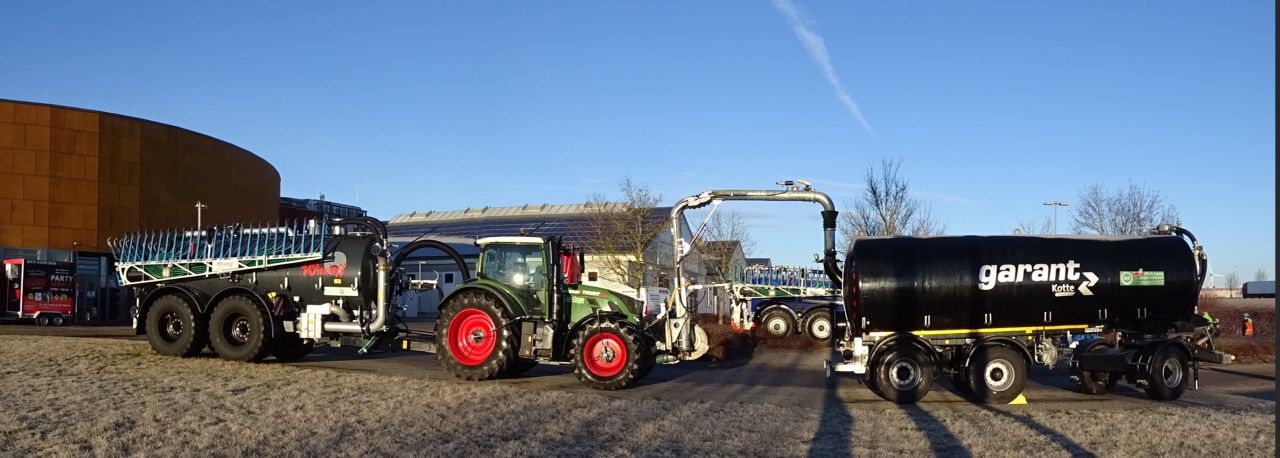 - Ausbringung direkt ab Güllebehälter mit 240 PS Schlepper und 15,5 cbm Wienhoff-Profi-Güllefass mit Reifendruckregelanlage und Bomech-Schleppschuhverteiler (15 m Arbeitsbreite).